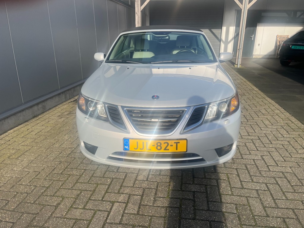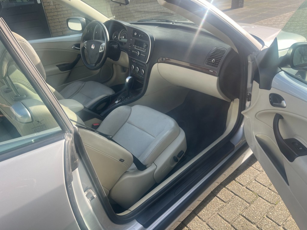 Saab Cabrio in de fraaie snowzilver metaalic kleur en beige leer.